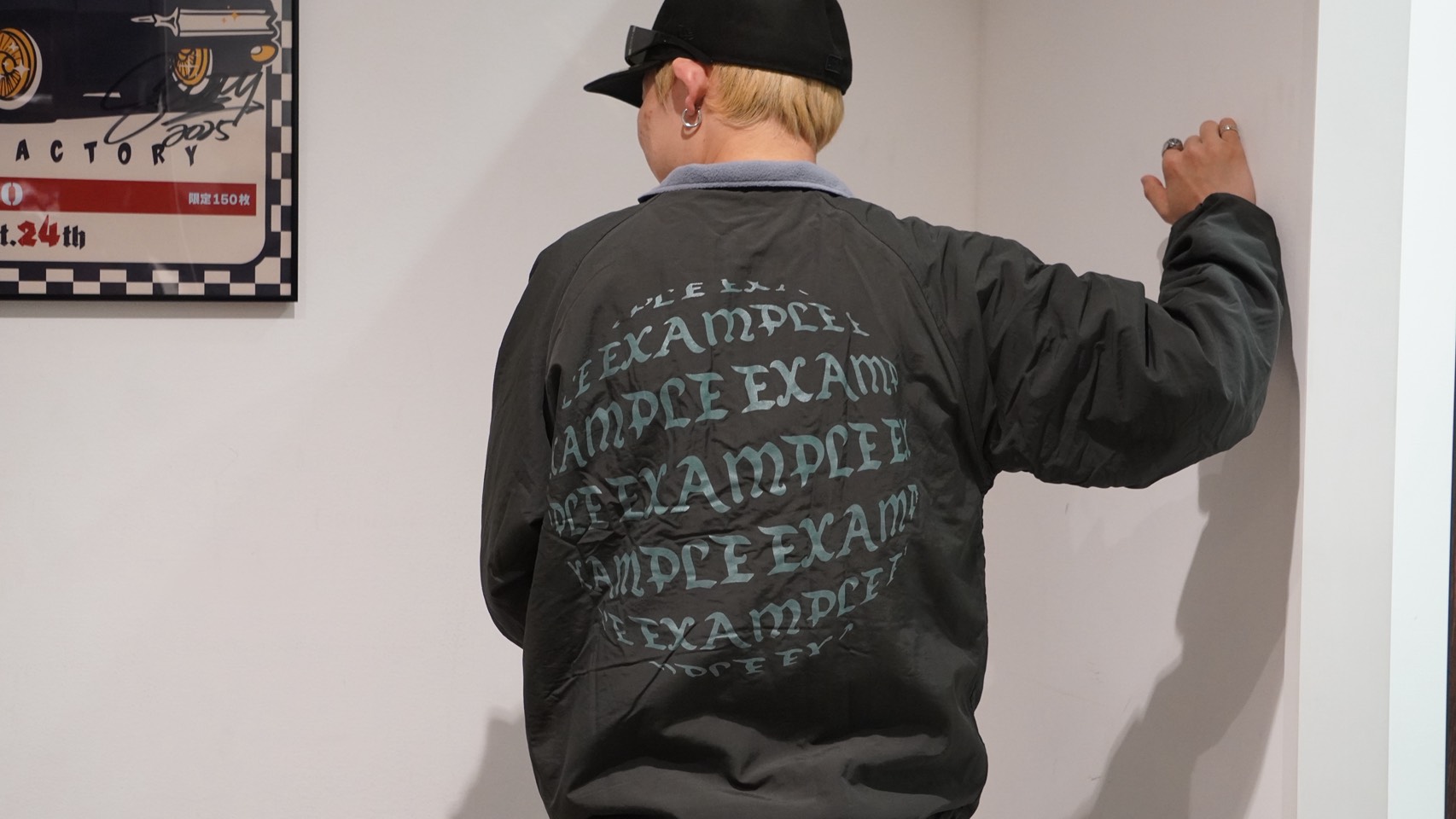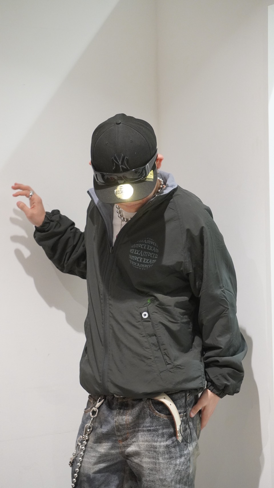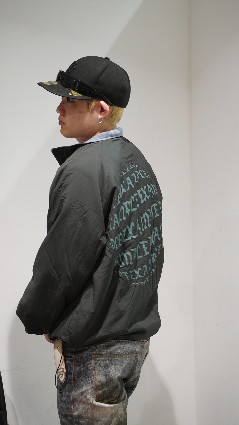 表地のシャカシャカの方は胸元とバックにEXAMPLEのブランドロゴを球体にしたものが描かれていて、派手過ぎずでもアクセントのあるデザインになっていて使いやすい!!