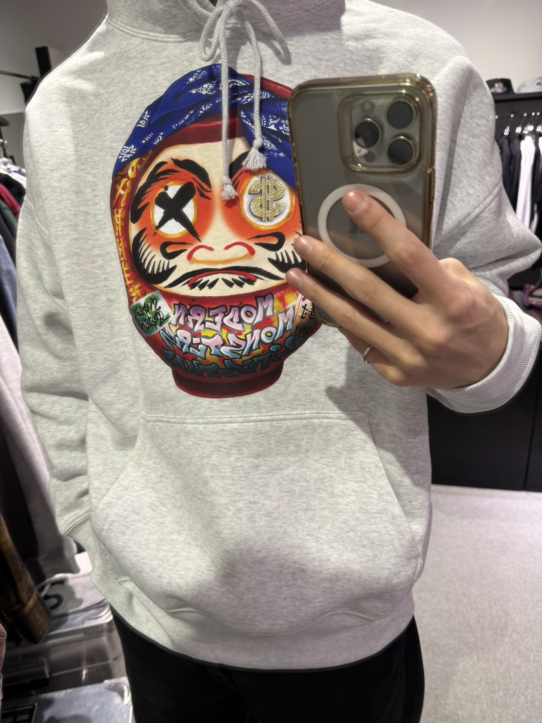 フーディーのフロントに大胆に配置したインパクト抜群のDARUMAプリントが特徴です。
